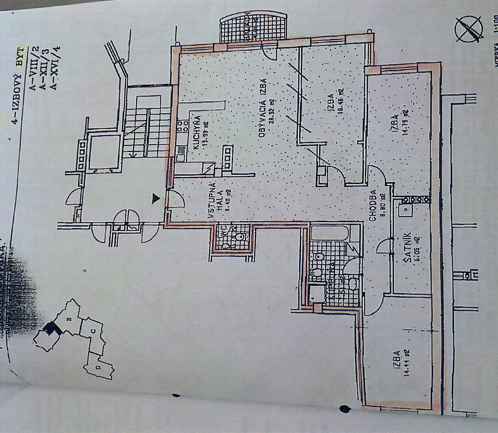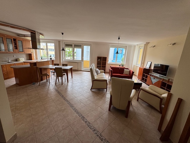 Dispozícia: Byt bol pôvodne 4-izbový, v súčasnosti upravený na priestranný 3-izbový. Tvorí ho veľká obývacia izba, samostatná kuchyňa, dve spálne, kúpeľňa, samostatné WC, šatník a priestranná vstupná hala. Technický stav: • plastové okná • vlastné plynové kúrenie (etážové) • kúpeľňa a WC po rekonštrukcii • ostatné časti bytu v pôvodnom, udržiavanom stave