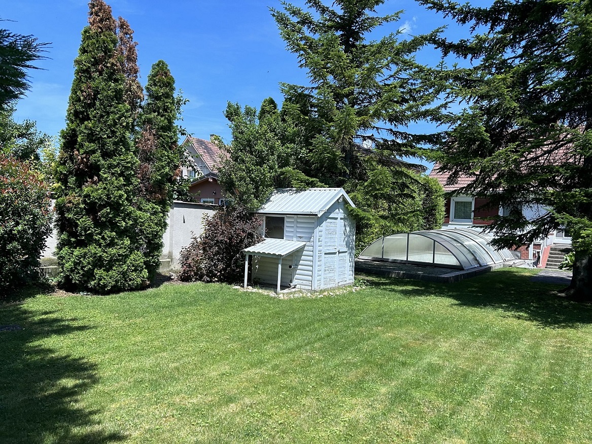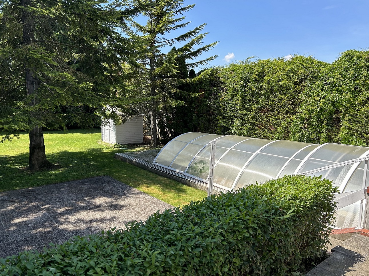 Záhrada je okrasná, s udržiavaným trávnikom (so závlahovým systémom) a vzrastlými ihličnatými stromami, na nej sa nachádza bazén zastrešený lexanovou konštrukciou a „domčekom“ na bazénovú technológiu.